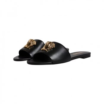 Elevate Your Style with VERSACE Black Leather Slip-On Sandals